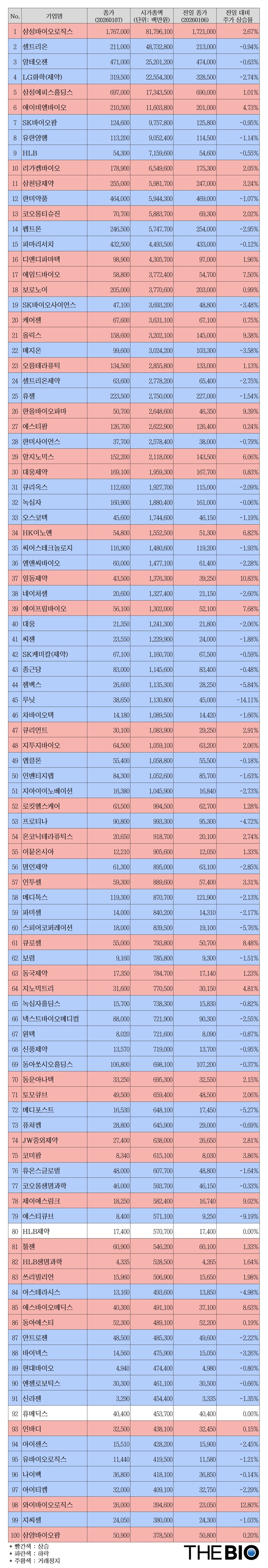 바카라 커뮤니티 [시가총액 모니터] 제약바이오 상장기업 ‘톱 100’(1월 7일)